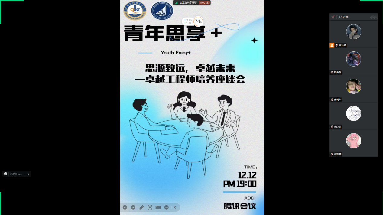 12月11日晚上,beat365线上召开“青年思享+”卓越工程师培养座谈会。beat365党总支副书记兼副院长顾姗姗主持会议,副院长李辉,卓越工程师负责老师陈卓,赛轮集团股份有限公司、软控股份有限公司、中科星图智慧科技有限公司和青岛思锐卓远信息技术有限公司的企业导师参加座谈。