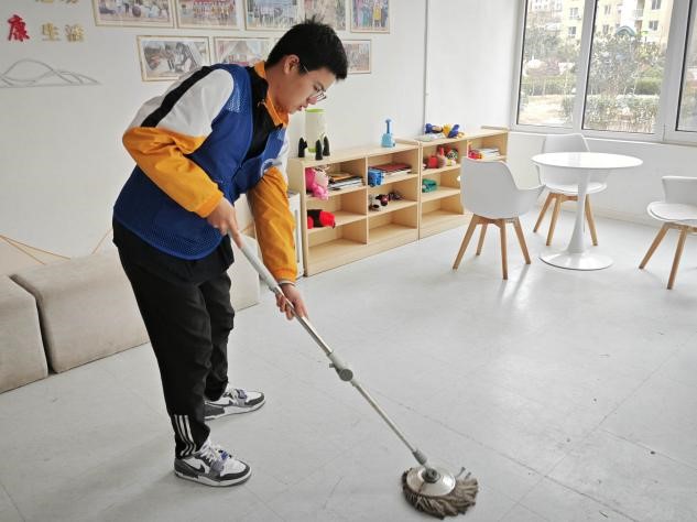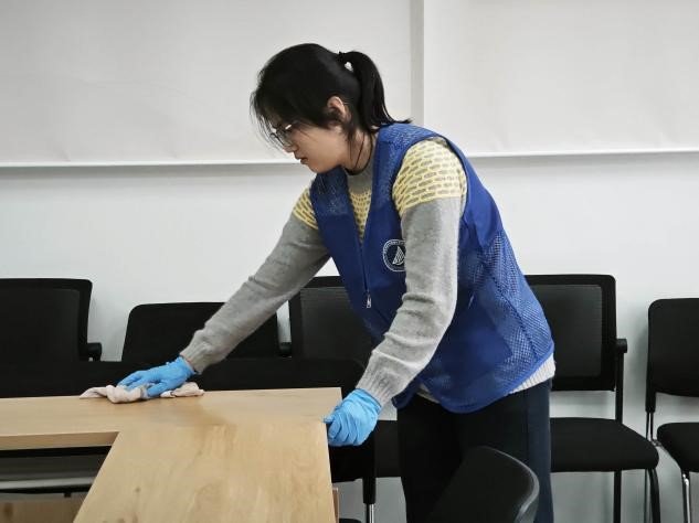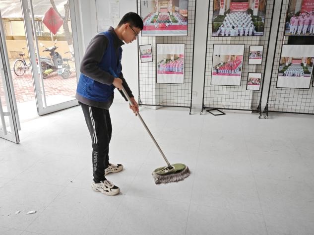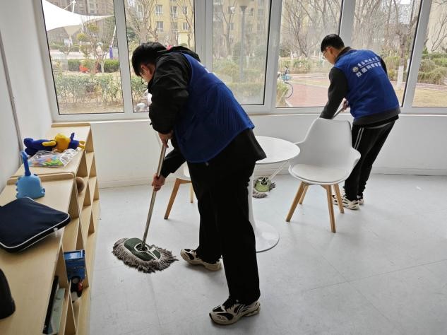 在活动现场,“小星云”志愿服务队的成员们充满活力,他们手持扫帚、拖把和抹布等清洁工具,各司其职,投身于社区的清洁任务中。志愿者们专注地扫地、拖地、抹桌子,确保地面无尘土,桌面干净明亮。他们细致地工作,确保每一个角落都整洁有序,用实际行动传递着雷锋精神的温度。