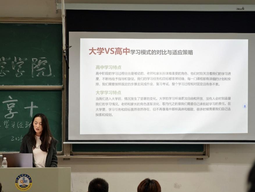 分享会上,各专业优秀学生代表结合自身经历,从多个维度展开了详尽分享。人工智能243班团支书候菁林剖析了大学与高中在学习模式、生活方式上的显著差异,引导新生尽快转变角色。大数据241班李康宁围绕以目标为导向的学习理念,系统拆解大学学业成绩的构成逻辑与竞赛参与的实践路径。学长学姐们建议学弟学妹们要懂得张弛有度,在刻苦学习之余注重身心调节,更要避免陷入盲目比较与焦虑的情绪,坚定目标,走好自己的成长道路。