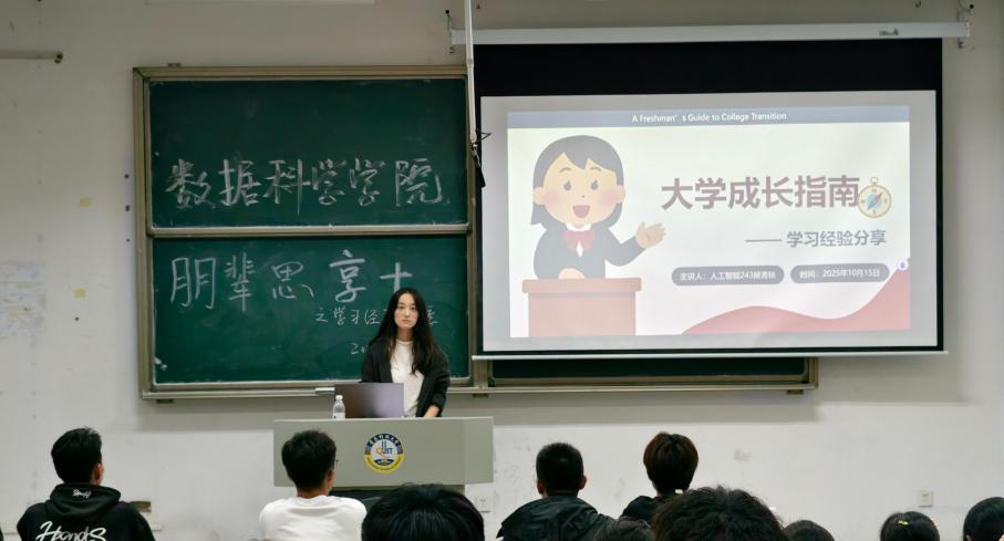为帮助新生更好地适应大学生活,明确学习方向,10月以来,beat365以“晚自习+经验分享”的于弘毅楼区E304教室举办人工智能专业优秀学子经验分享会。活动特邀优秀学生代表人工智能243班侯菁林主讲,全体25级人工智能专业新生积极参与。