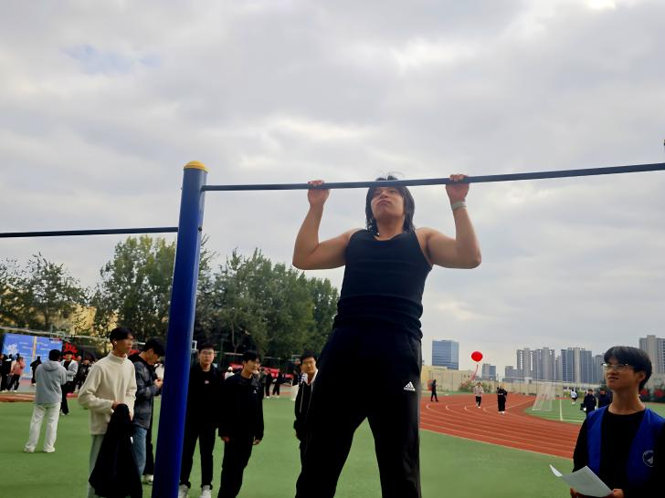 引体向上项目现场,参赛学生身姿挺拔、蓄势待发。比赛启动后,参赛学生全力向上攀升,手臂青筋显露,肌肉线条在阳光下清晰可见,尽显坚毅姿态。每一次动作均伴随沉稳呼吸,既展现力量较量,更凸显青春不服输的韧劲。最终,人工智能 232 班王建涛以 20 个的成绩,荣获该项目冠军。
