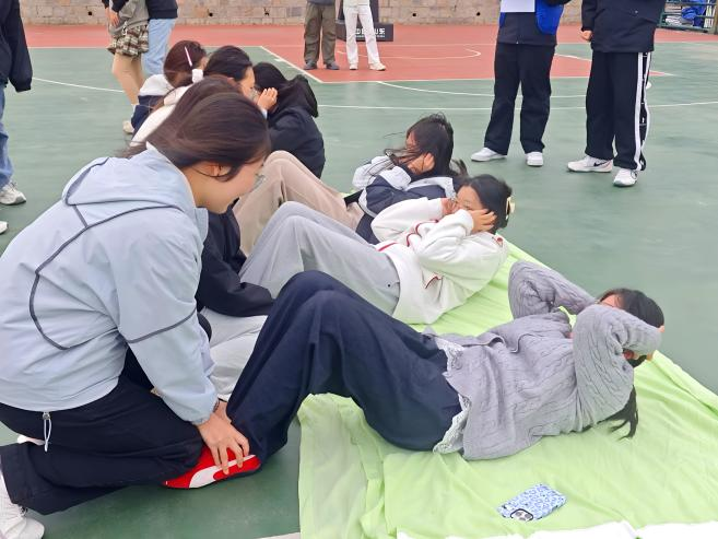 仰卧起坐区域气氛热烈,参赛学生以两人为一组开展比拼:一人平躺发力完成动作,另一人按住其脚踝协助计数。学生们腰背交替收缩舒展,汗水滑落草坪,部分参赛学生凭同伴鼓励突破体力极限,充分彰显拼搏精神。人工智能 253 班李梓涵表现突出,以 50 个的成绩斩获该项目冠军。