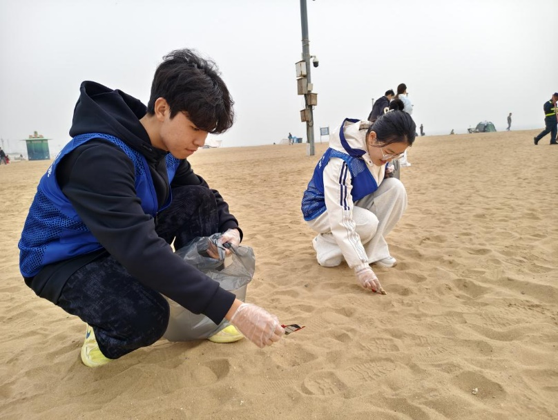 理论学习环节圆满结束后,志愿者们迅速转入实践行动阶段。大家统一领取环保工具,按既定方案分组编队,沿石老人海水浴场海岸线开展拉网式垃圾清理作业。志愿者们分工明确、协作高效,对沙滩及近岸区域散落的塑料碎屑、废弃包装物、烟蒂、枯枝落叶等各类垃圾进行全面排查、逐一捡拾,并严格依据所学分类标准,将各类垃圾精准投放至对应分类收集容器,确保“分类收集、规范处置”落到实处。